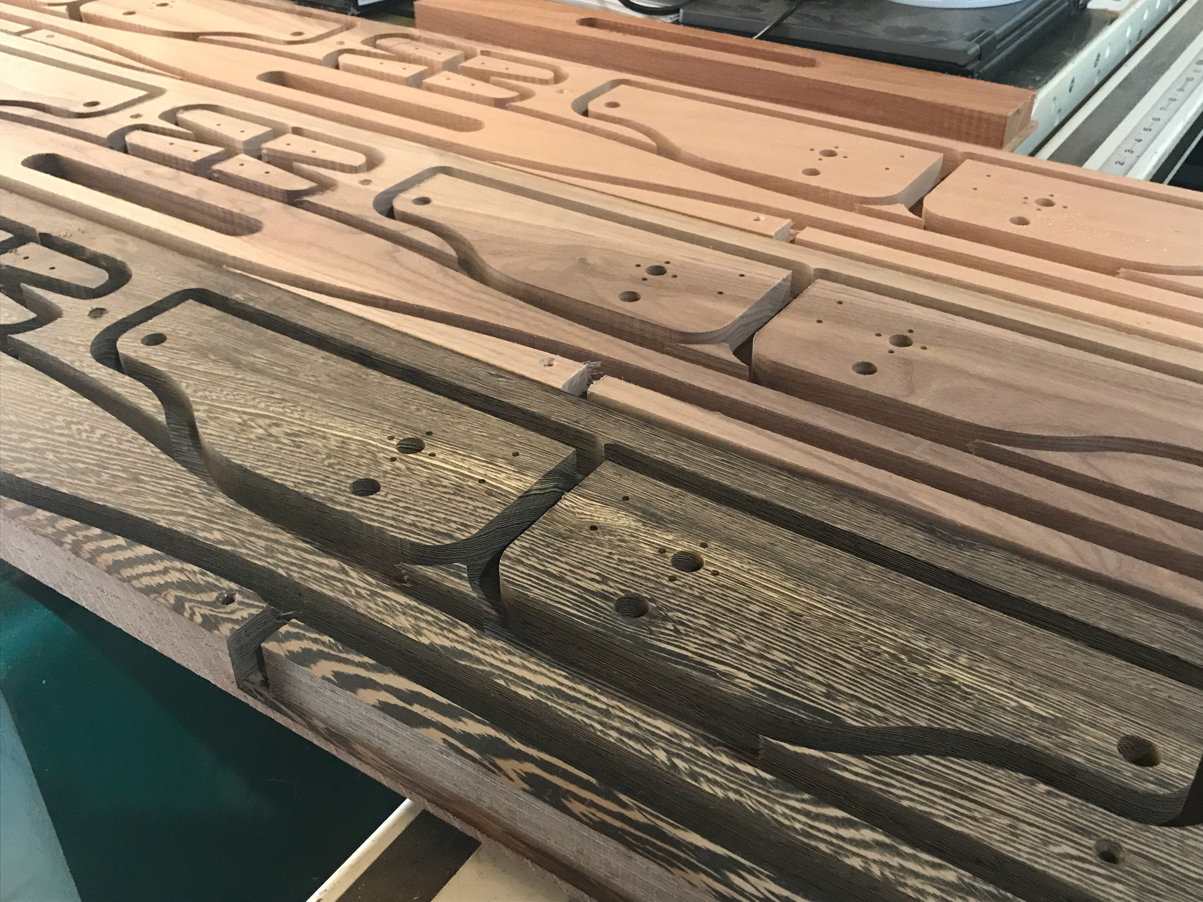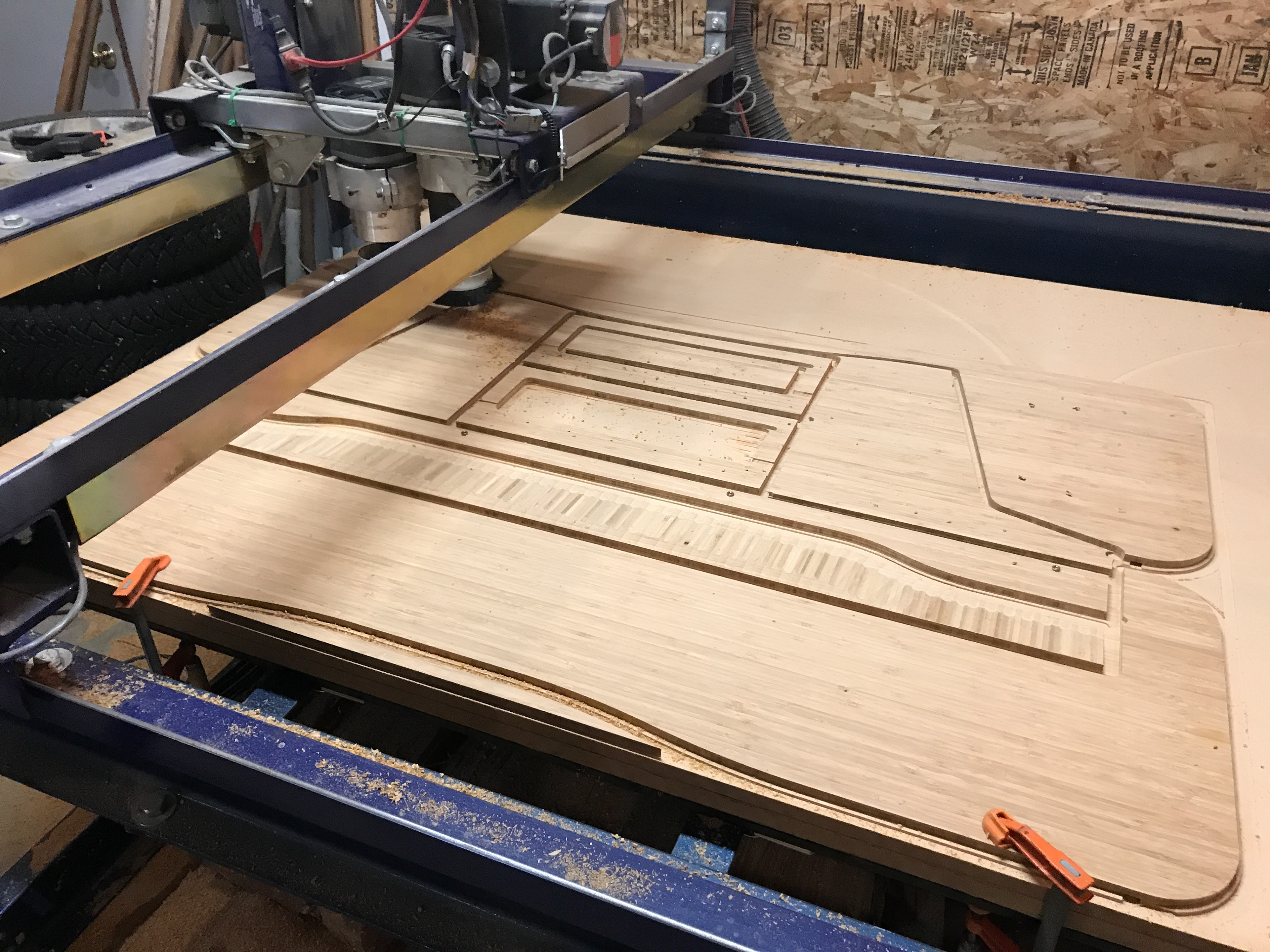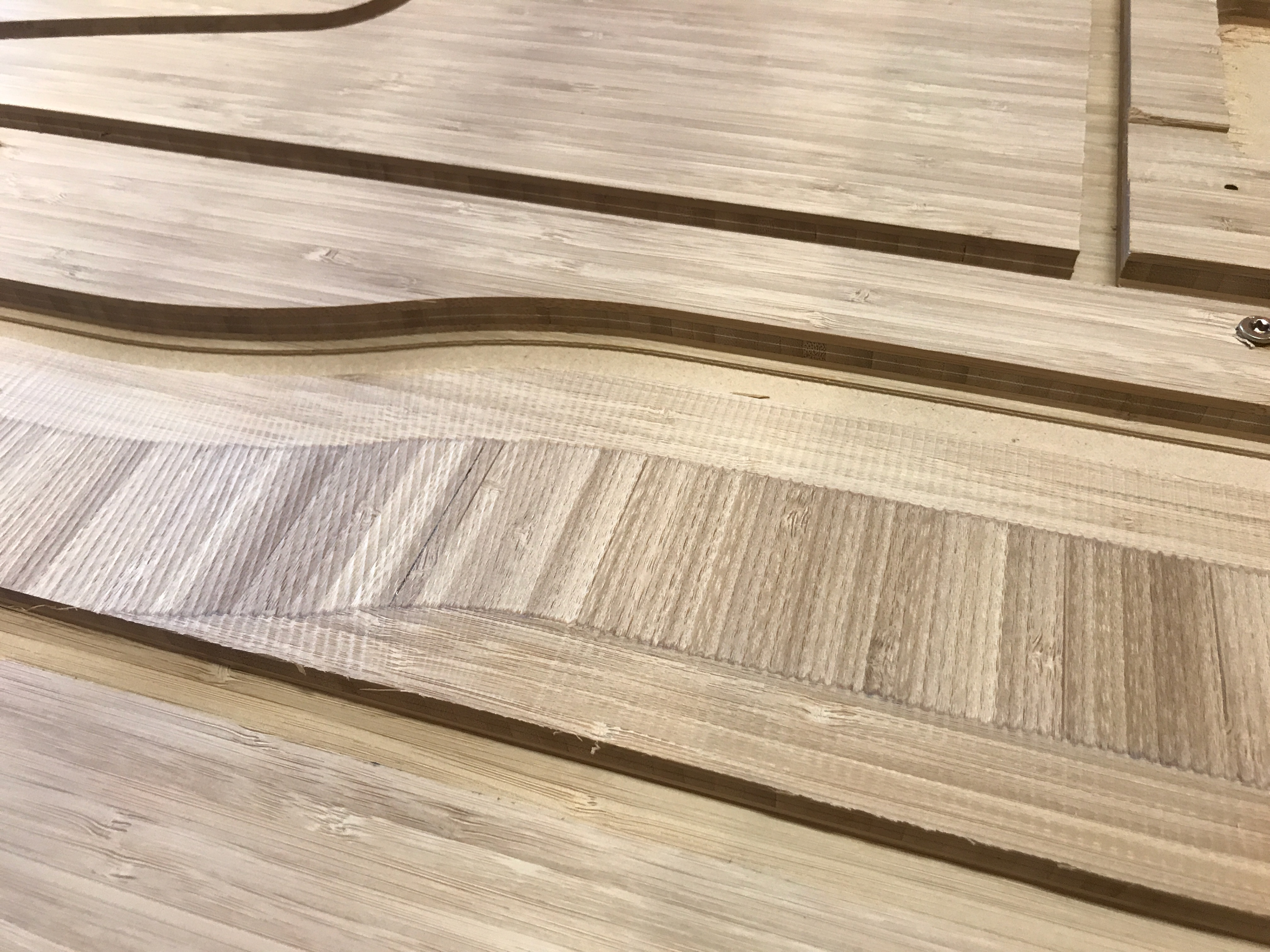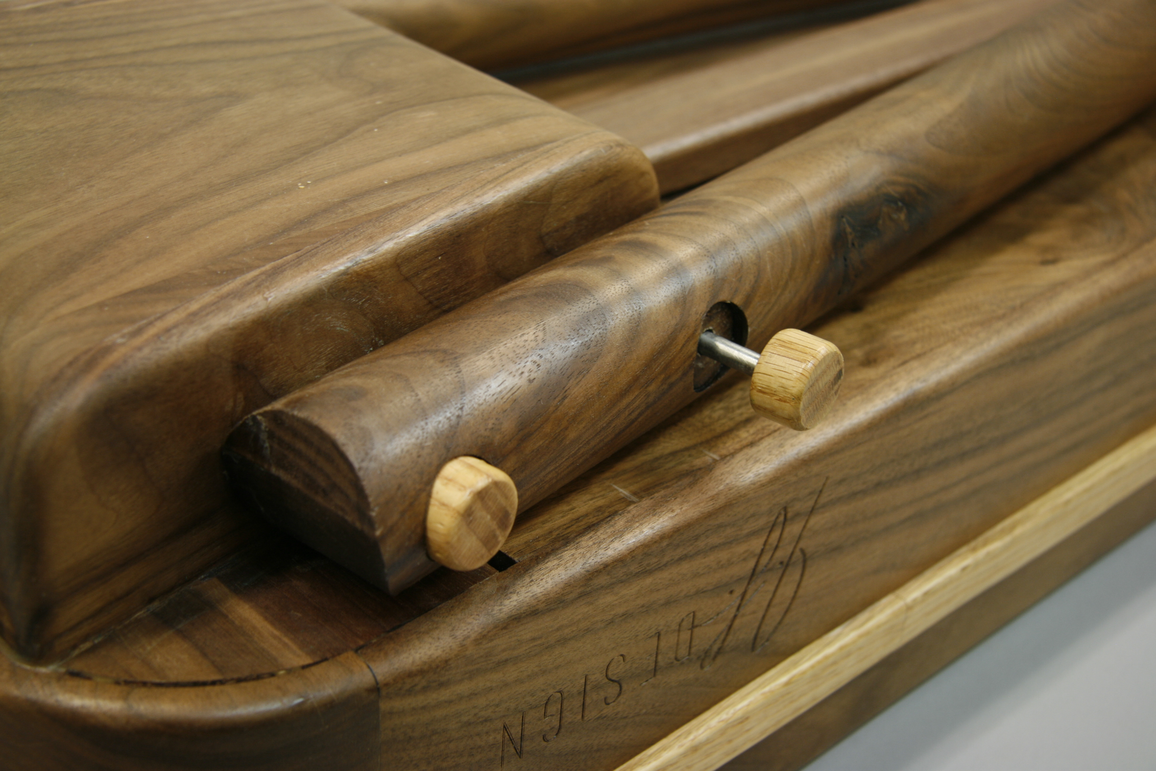 Building the prototypes presented challenge after challenge. Using Solidworks to create the digital models, I began my methods for construction. The exterior shell that appears to be one continuously curving piece of wood is made up of sixteenth inch veneer and balsa core to keep it light. The form is secured with epoxy, compressing the components together between a female and male MDF mold. Utilizing a CNC machine, bamboo plywood and hardwood components were then created to complete the top and bottom surfaces, fit together like my own big kid puzzle piece.